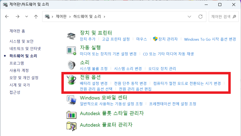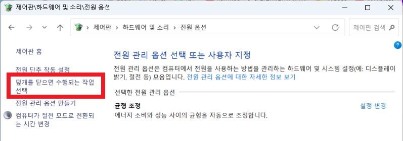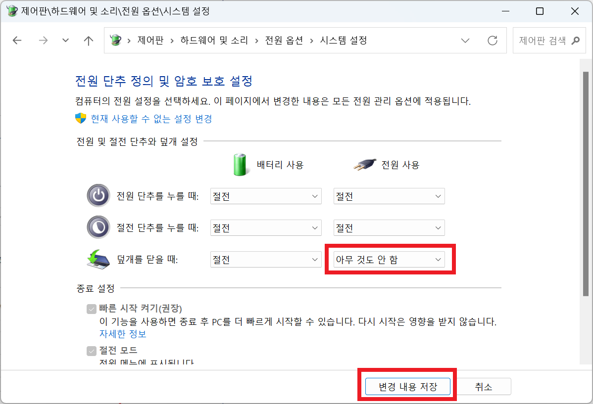 - 덮개를 닫을때 - 전원사용 을 "아무것도 안함" 으로 바꾼다