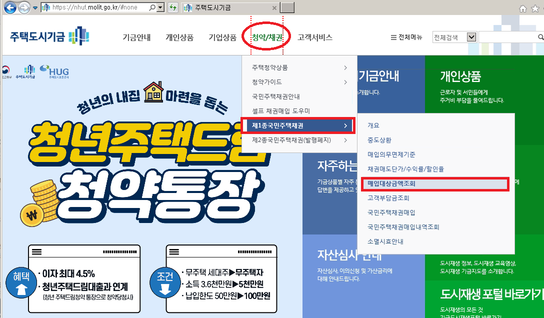 전체 메뉴 에서 : "청약/채권 > 제1종 국민주택채권 > 매입 대상금액 조회" 로 갑니다