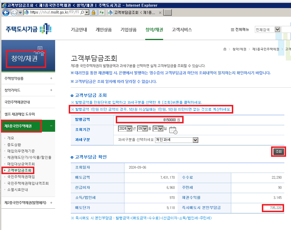 다시 "국민도시 기금 ( https://nhuf.molit.go.kr/ ) > 청약/채권 > 제 1종 국민주택 채권 > 고객 부담금 조회 " 에 들어 갑니다