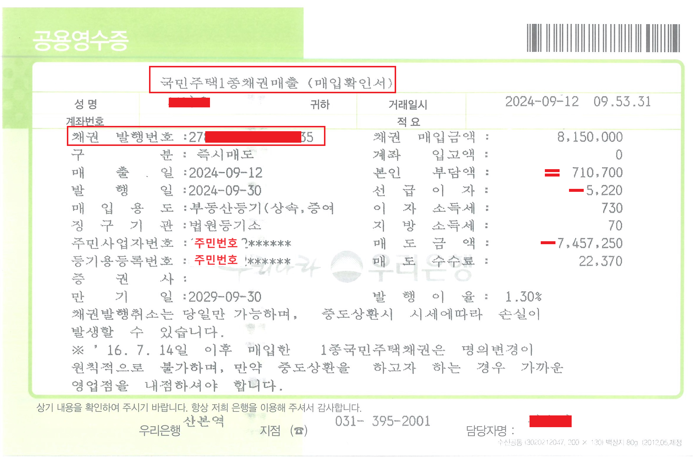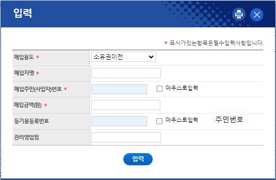 > 매입자명 , 주민 번호, 금액 쓰고
