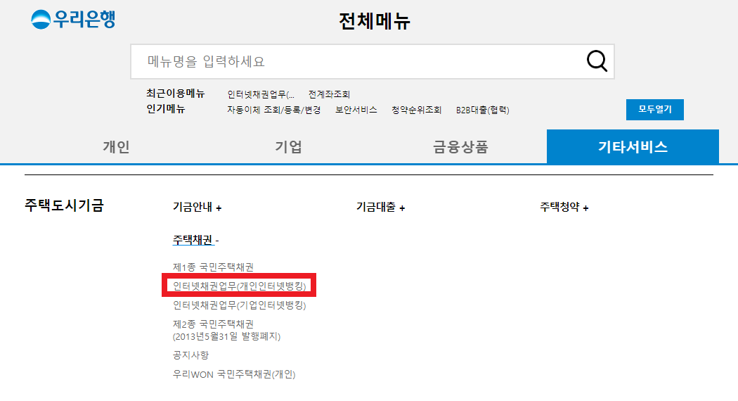 > 전체 메뉴 > 기타 서비스 > 주택채권 으로 간다