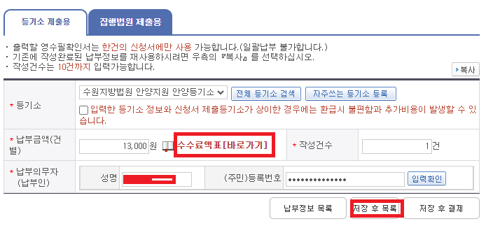 > 소유권 이전 등기 전자 표준 양식 ( e-form ) 의 경우 13000원 (2024 년 현재) 을 납부금액에 넣고 [저장후 목록]으로 간