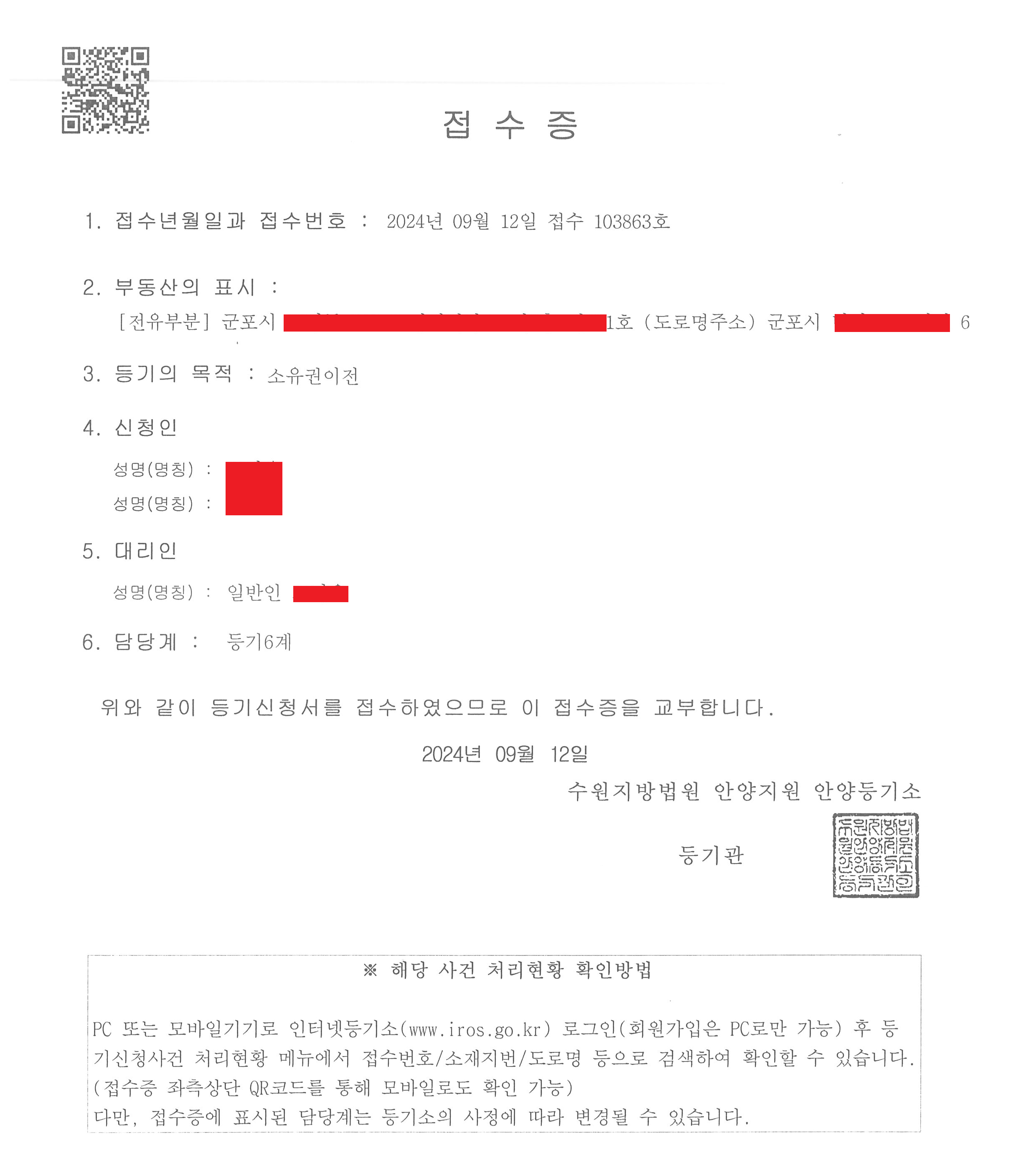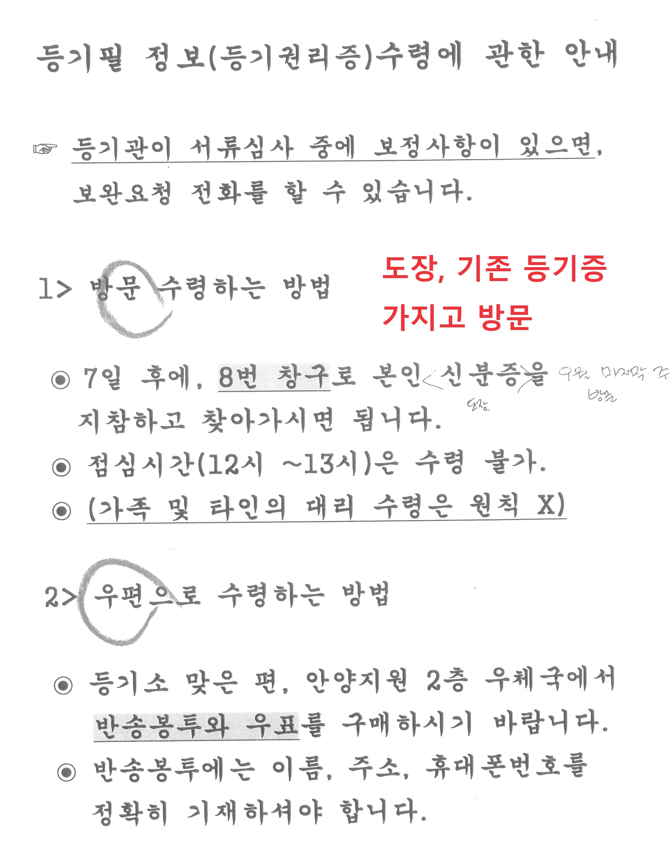 1. 접수증과 완료된 등기필 정보(등기권리증)수령 안내문을 준다