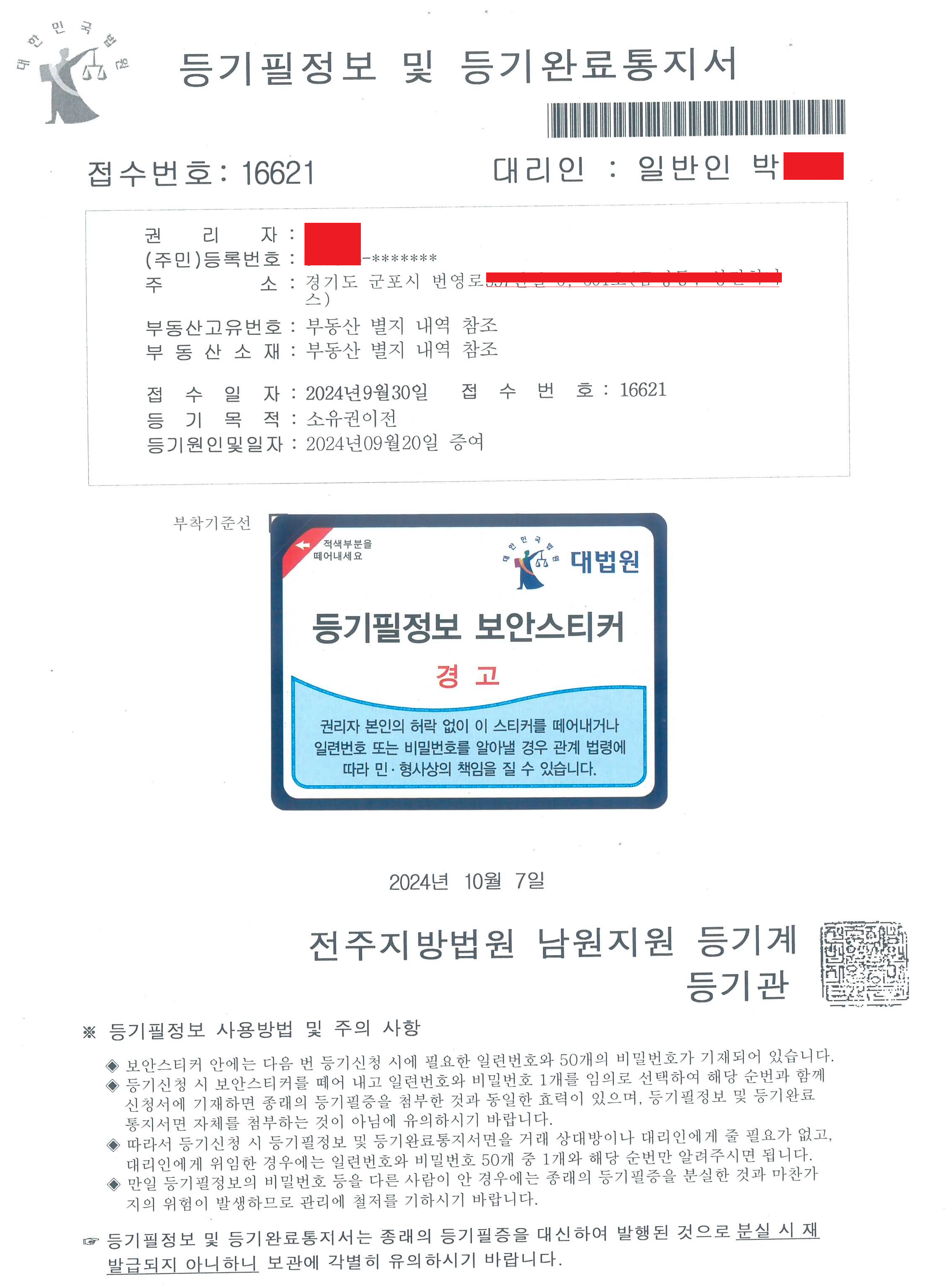 1. 등기필정보 및 등기완료통지서