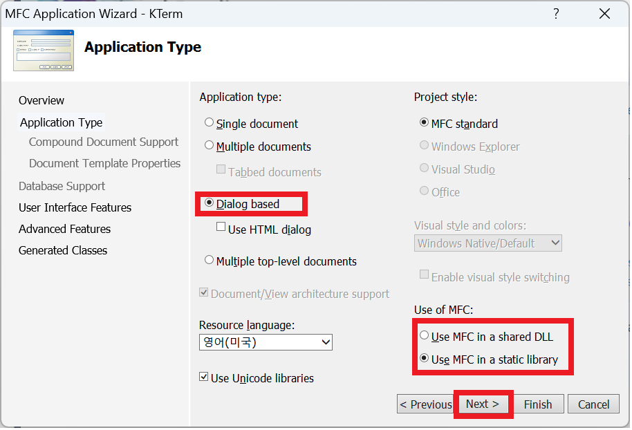 > Dialog based 선택.. 뭐 다른거 해도 되는데, 여기서는 일단 이거