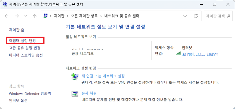 2. "제어판\모든 제어판 항목\네트워크 및 공유 센터" 에서 > 어뎀터 설정 변