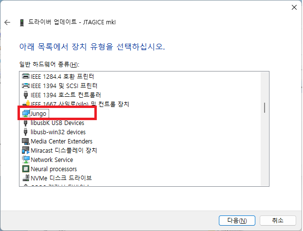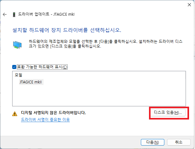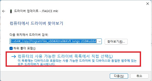 4. JTAGICE mkii 에서 마우스 오른쪽 버튼 > 드라이버 업데이트 > 아래 따라서 주~욱 합니다.
