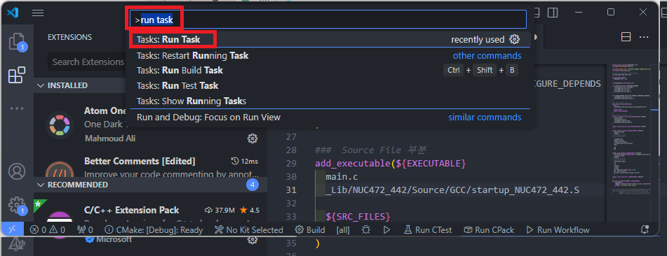 > [F1] 을 누르시고 "run task" 를 타이핑 또는 선택 하시고,