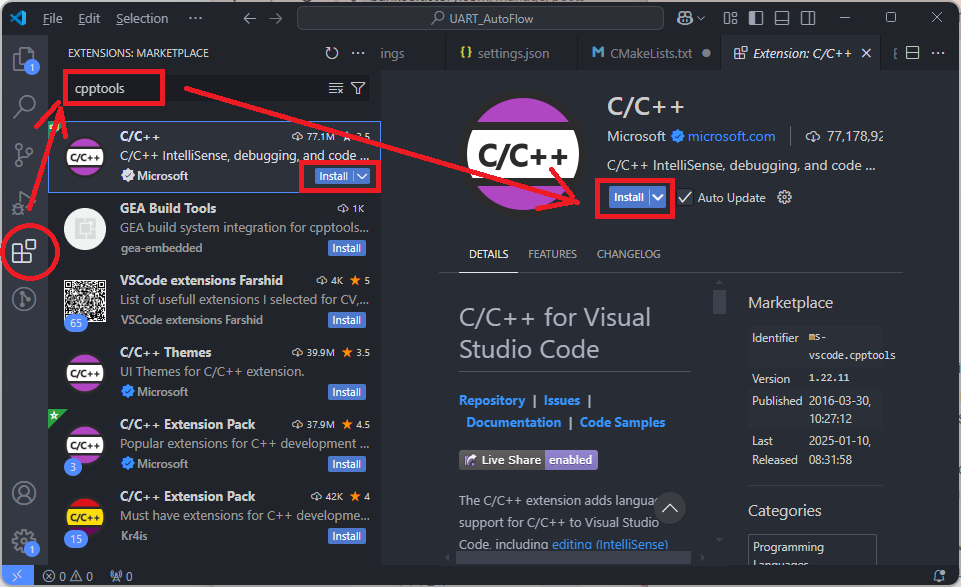 - Ctrl+Shift+X 를 누르면 Externtions Market Place 가 나오며 여기서 "cpptools" 를 타이핑 합니다.