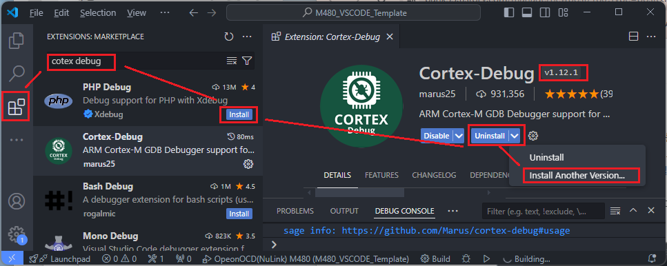 > Ctrl+Shift+X 를 누르면 Externtions Market Place 가 나오며 여기서 " cortex debug " 를 타이핑 합니다.
