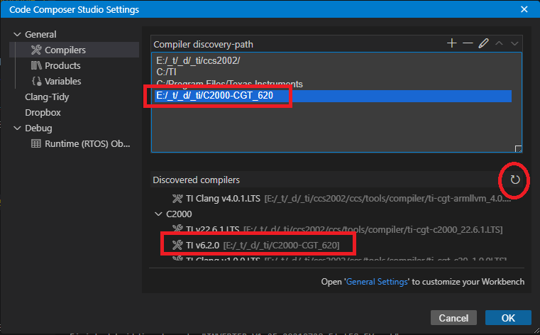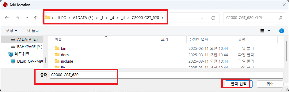 > 설치 했던 디렉토리 "E:\_t\_d\_ti\C2000-CGT_620" 를 선택 합니다.