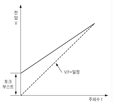 기존의 범용 인버터 제어는 f(주파수)를 가변 할 경우에 V(출력 전압)와의 비율(V/f)이 그림의 점선과 같이 일정하게 되도록 하고 있습니다. 따라서 이 방식을 V/F 제어라고 부릅니다.