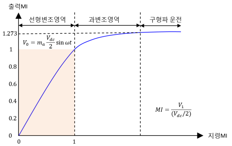 앞서 설명했듯이 지령 전압의 범위가 삼각 반송파 범위보다 크지 않아야 합니다. 이 범위를 선형 변조 영역이라 하며, 선형적으로 얻을 수 있는 최대 기본파 전압은 6-step 운전 전압 (=2V/π, 식 3의 기본파)의 78.5%입니다. MI > 1 인 영역은 과변조 영역으로 지령 전압과 출력 기본파 전압의 관계가 선형적이지 않은 영역입니다.