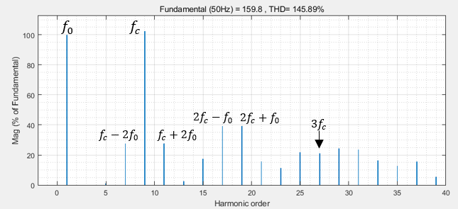 SPWM에서 극전압의 고조파 성분을 분석하면 그림 7과 같습니다. 400V 시스템이고, 진폭 변조 지수가 0.8이기 때문에 기본파의 크기가 160 정도 되는 것을 알 수 있습니다. 주파수 변조는 9이기 때문에 극 전압의 고조파가 9번째 고조파 성분에서 가장 크게 나타나는 것을 확인할 수 있습니다.
