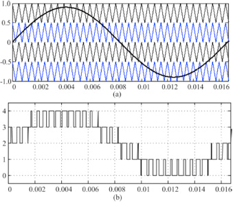 아래 그림은 SPWM 변조 기술에 대한 4레벨 이동 삼각 캐리어와 단일 사인파 파형을 표시합니다. 이 그림을 기반으로 사인파 파형과 삼각 파형 사이의 모든 교차점은 원하는 출력 레벨을 생성합니다