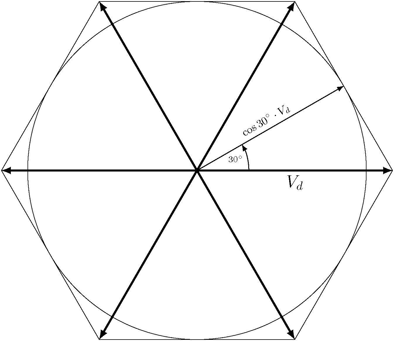 이는 입력 전압보다 낮지만, 육각형을 살펴보면 그 이유가 분명해집니다. 인접한 기본 벡터를 번갈아 가며 변환할 때 평균을 구하고 그 과정에서 일부 전압이 "손실"되기 때문입니다.