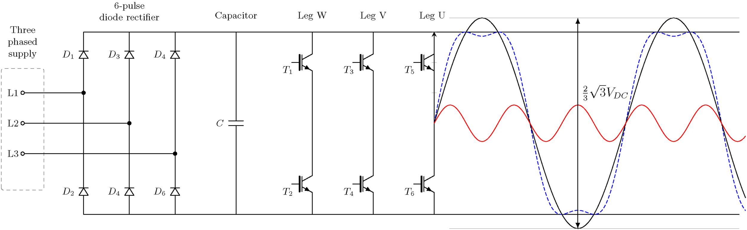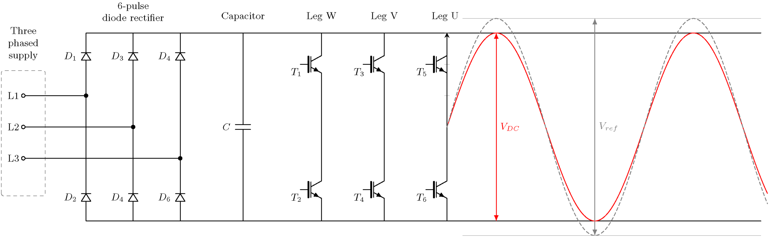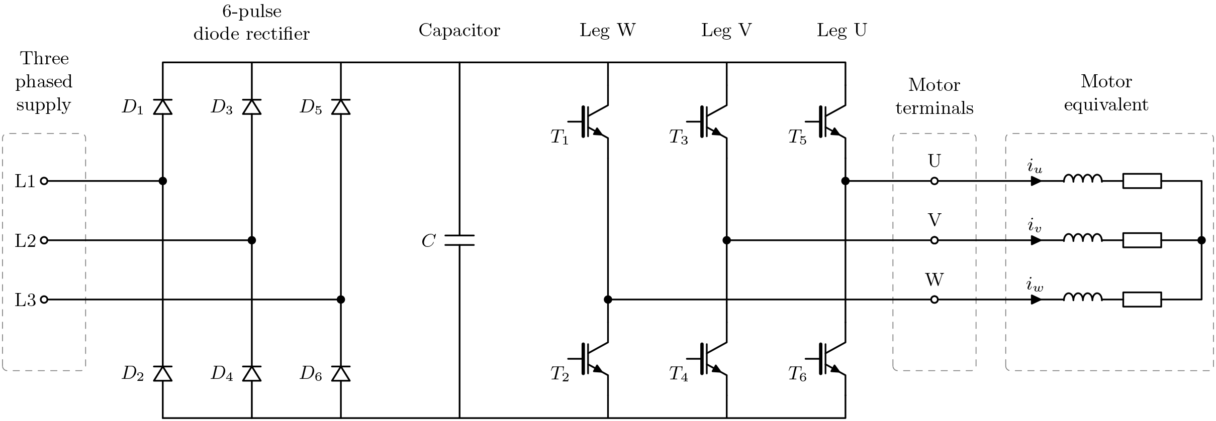 - 첫째, DC 링크 전압은 일정하도록 단순화할 수 있습니다. 일반적으로 부하에 따라 변동하지만 이 글에서 다루는 시간 프레임 동안에는 그다지 많이 변하지 않습니다. 따라서 공급 장치 및 다이오드 정류기는 이 글의 나머지 부분에서는 표시되지 않습니다.