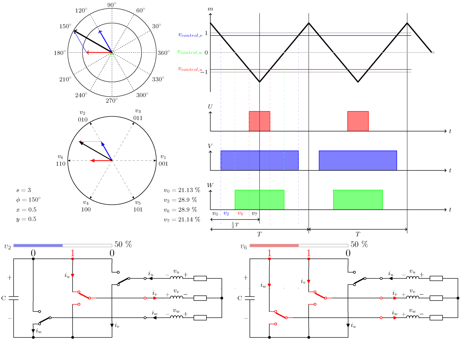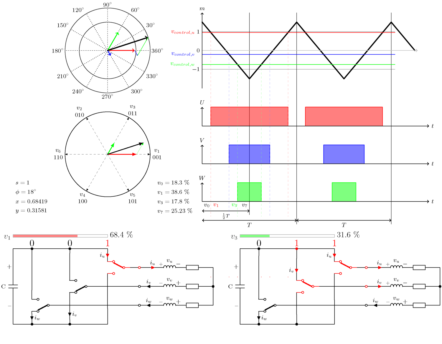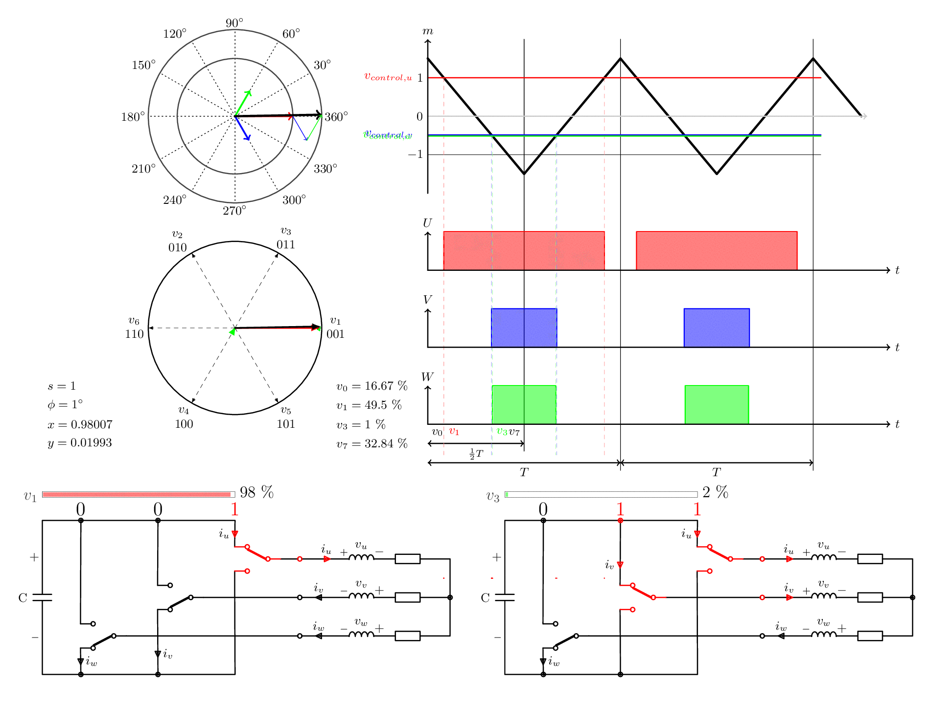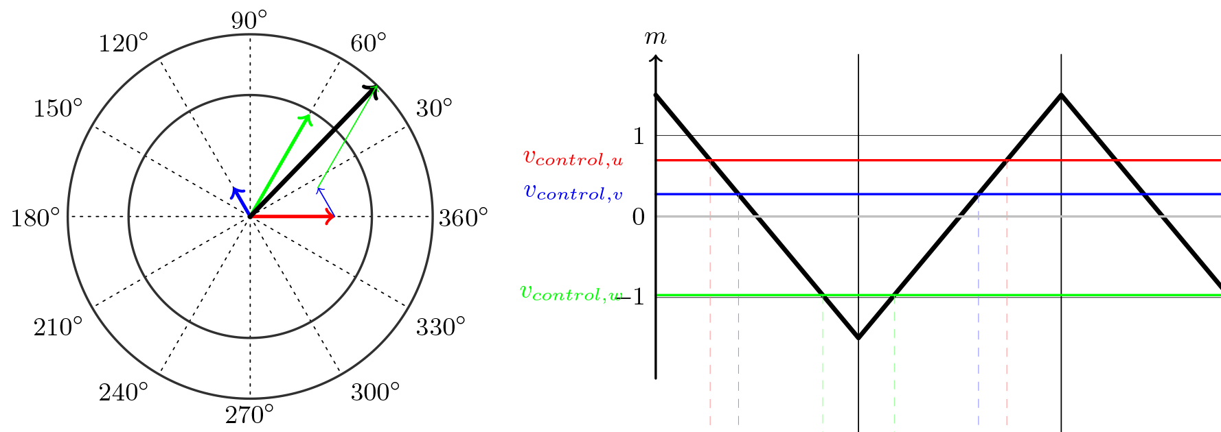 보시다시피 U-위상(빨간색)은 최대 양의 값에 가깝습니다. 이 수준은 또한 원 오른쪽의 그래프에 여기서 제어 전압이라고 하는 삼각파와 함께 표시되어 있으며,. 이 삼각 파형의 주파수는 공간 벡터의 주파수보다 몇 배 더 높습니다. 일반적으로 1~20kHz이지만 수백 헤르츠 또는 최대 수백 킬로헤르츠의 응용 프로그램도 많이 있읍니다.