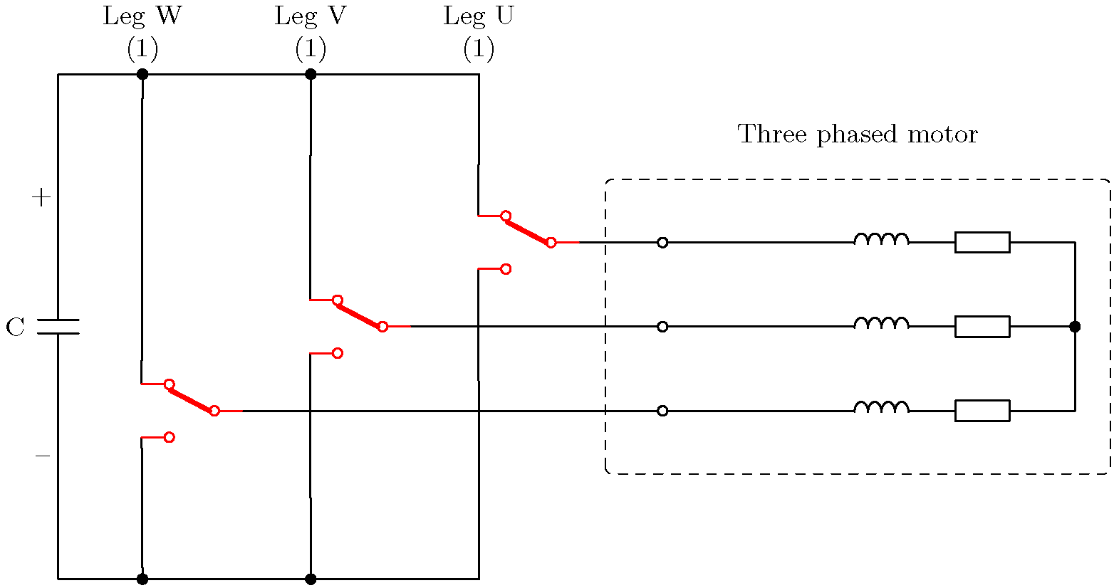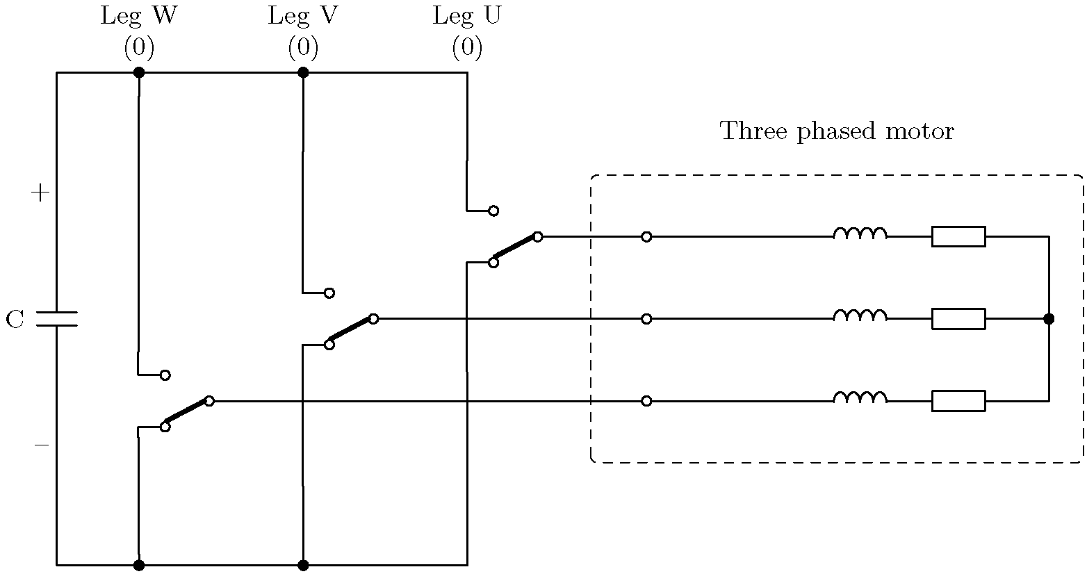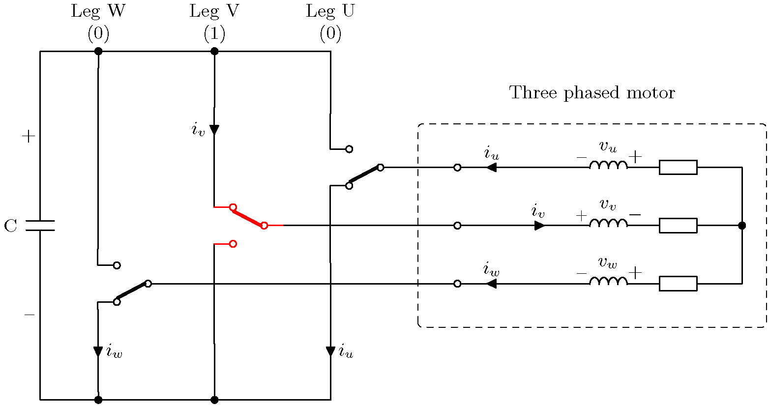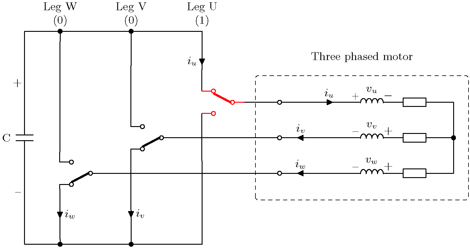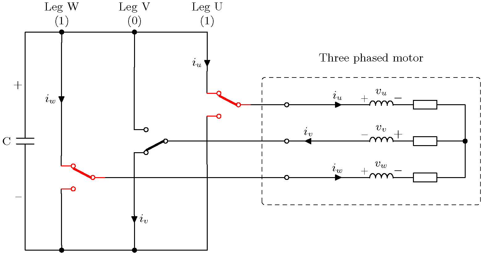위의 예는 가장 왼쪽의 레그(W)가 위쪽 트랜지스터를 닫고 아래쪽 트랜지스터를 여는 트랜지스터 조합을 보여줍니다. 다른 두 레그(V와 U)는 위쪽 트랜지스터를 열고 아래쪽 트랜지스터를 닫습니다. 이는 W상에 양의 전압을 적용하는 반면 다른 두 상은 음의 전압을 적용하는 것과 같습니다. 전류 화살표는 양의 DC 링크에서 음의 DC 링크로의 전류 경로를 보여줍니다.