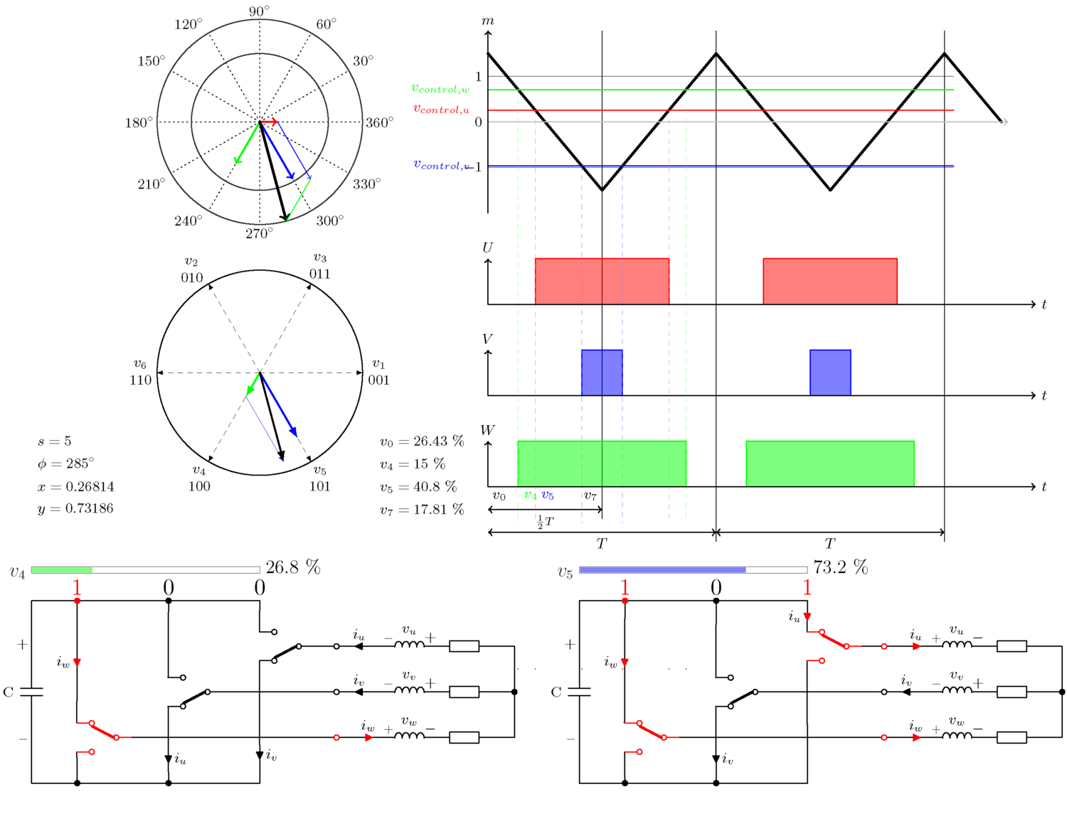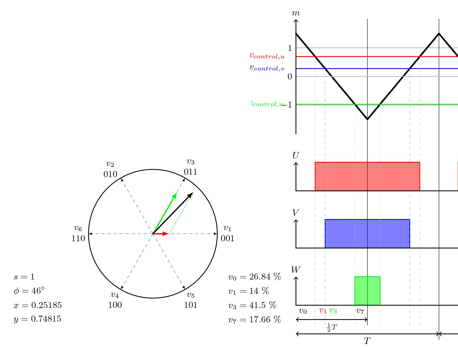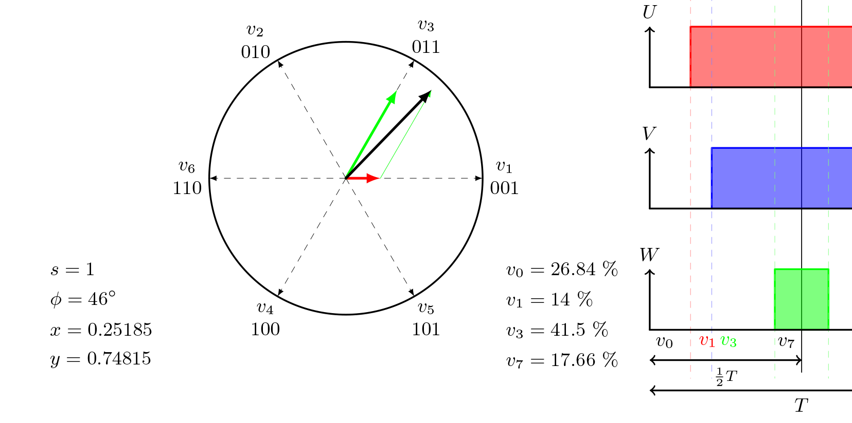 이 부분의 주요 초점은 삼각파에서 아래로 튀어나온 점선입니다. 이는 제어 전압이 삼각파와 교차하는 곳에서 시작됩니다. W축 바로 아래, 1/2 T 화살표 바로 위에 , 항상 4개의 다른 섹션이 보입니다. 위 그림에서는 v0, v1, v3, v7 입니다. 다른 공간 벡터 각도와 크기의 경우, 이 네 섹션의 너비는 바뀌지만, 전체 너비는 항상 동일합니다.