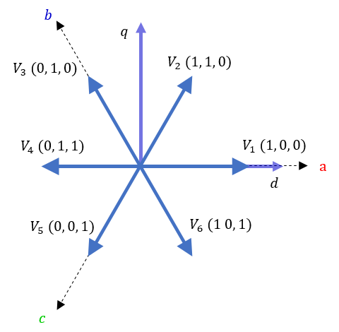 이러한 구성 중 여섯 가지(V1~V6)는 연결된 모터에 적용되는 다른 전압에 해당하며 지금부터 기본 벡터 라고 합니다. 마지막 두 가지(V0=000, V7=111)는 단자에서 0볼트를 나타내므로 0 벡터 라고 합니다 .