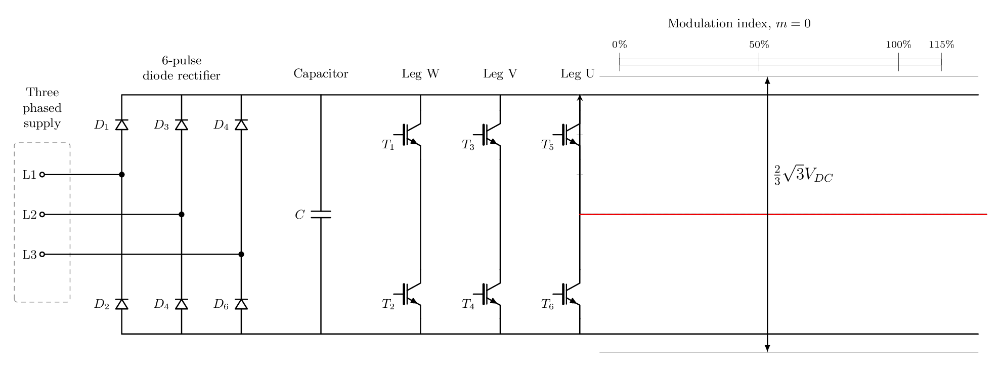 이는 몇 문단에서 언급한 것과 정확히 동일하며, 다른 관점에서 제시한 것입니다. 그리고 우리는 690V에 도달하기 위해 DC 링크 상한을 약 15% 정도 통과 해야 한다는 것을 보여주는 것 외에는 아직 문제를 다루지 않았습니다 . 이것은 불가능해 보일 수 있습니다. 상한은 스위치가 100%의 시간 동안 켜져 있는 스위칭 상태를 나타내는 반면, 하한은 켜진 시간이 0인 상태를 나타냅니다. 그렇다면 스위치가 100% 이상 또는 0% 미만 으로 켜질 수 있는 방법은 무엇입니까 ?