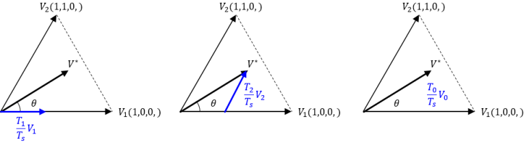 위 그림에서는 인버터가 사용 가능한 기본 벡터를 사용하여 합성해야 하는 참조 벡터의 예가 나와 있습니다.