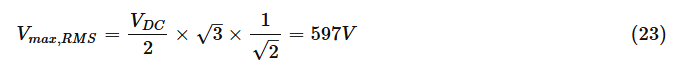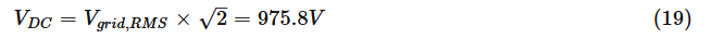 DC-링크의 최대 전압 출력은 DC-링크 전압이어야 합니다. 그 위에는 피크 대 피크 전압이 다음과 같은 빨간색 사인파로 표시됩니다.Vdc= 975V. RMS 위상 간 전압은 다음과 같습니다.