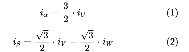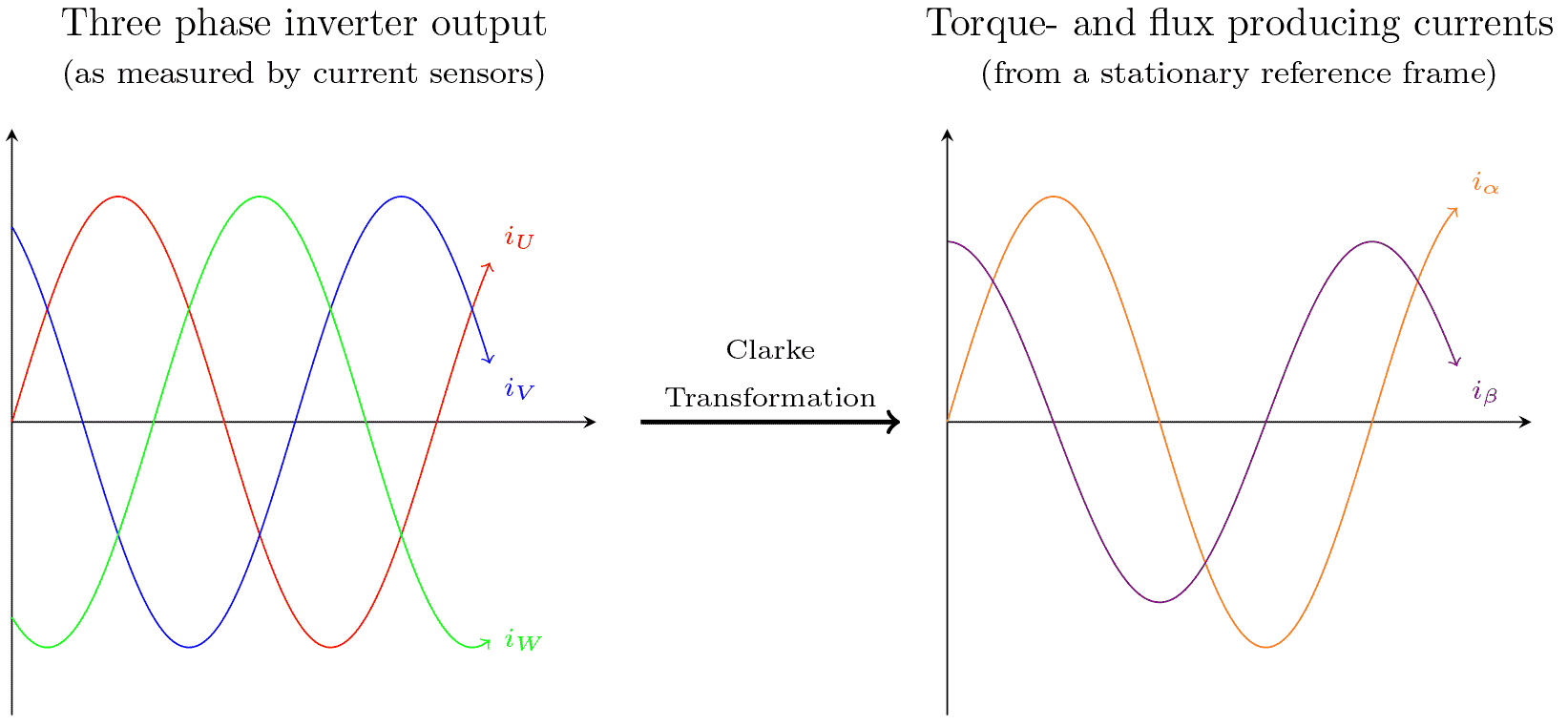 iu, iv그리고 iw 는 인버터에서 나오는 3상 전류를 나타냅니다. ia 그리고 iβ 는 각각 토크와 플럭스에 대한 두 개의 "새로운" 전류를 나타냅니다.