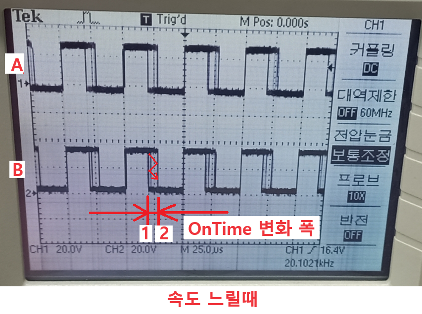 > 오실로스코프 사진 ( 0,1 도씩 변화 아니지만, 어째든 느린거와 3.0 도씩 변화 아니지만 어째든 빠른거 비교 )