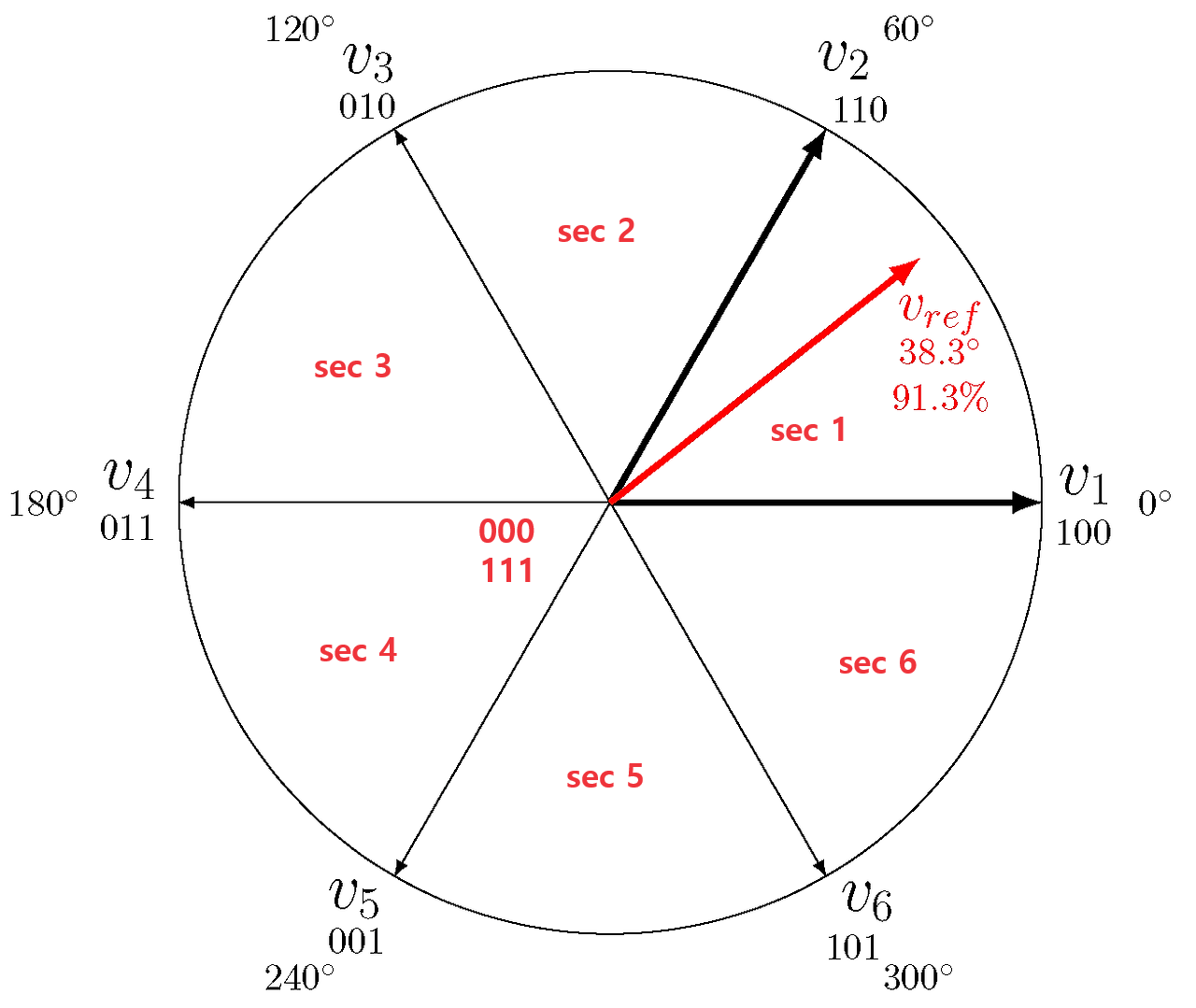 섹터: 공간 벡터 평면은 6개 섹터로 나뉨 (각 60°):