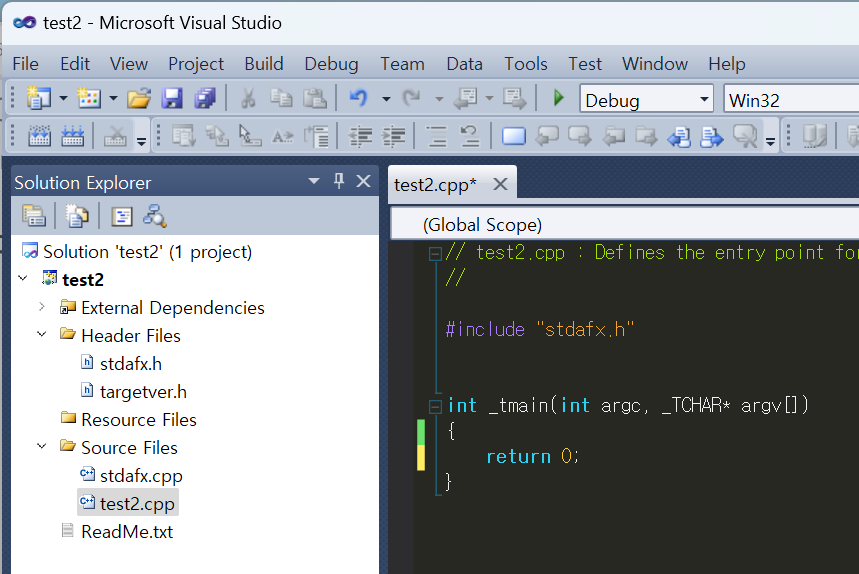 3. 기본 파일들이 만들어 집니다. test2.cpp 화일을 봅니다.