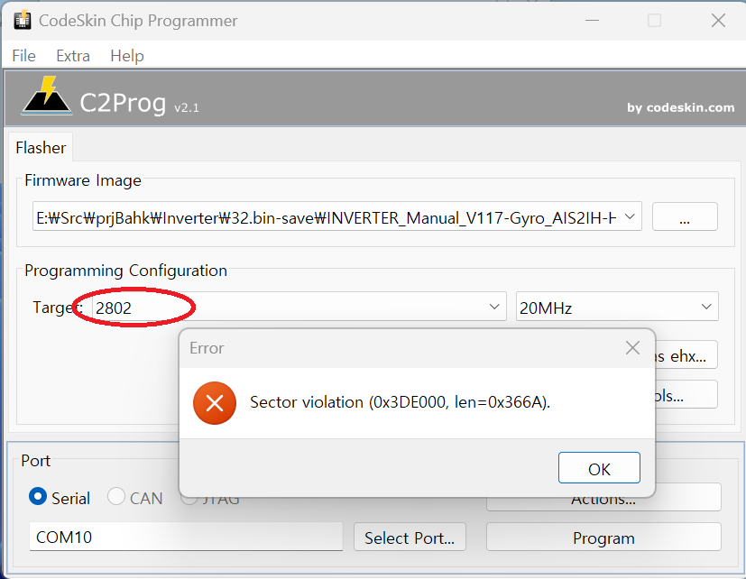 - 아래와 같은 에러 즉 " Sector violation (0x3DE000, len=0x366A) " 등 은 Target 잘못 선택 되었을때 나타난다.