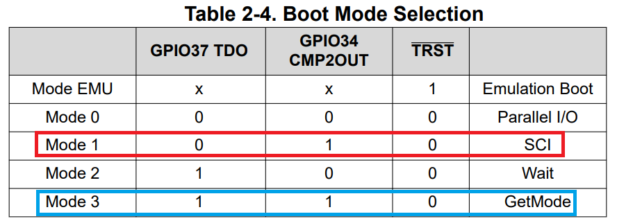 SCI Boot Mode 진입 하기 위해서는 TDO(GPIO37) 핀을 부트때 Low 으로 만들어 주면 됩니다.