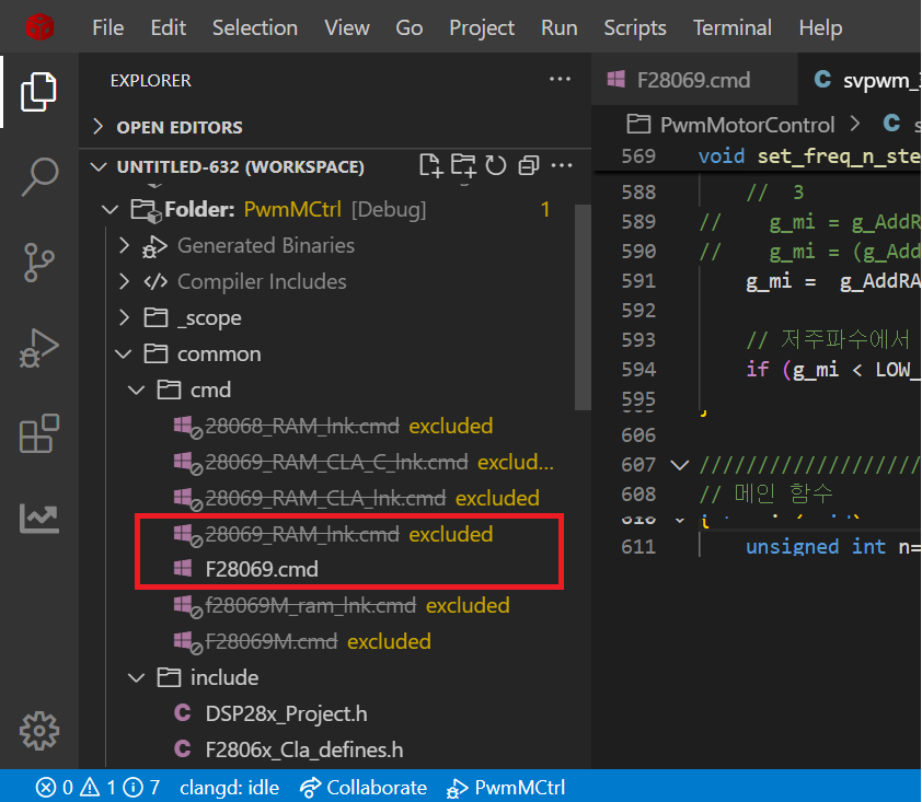 > FLASH 에서 실행 할때는 28069_RAM_lnk.cmd 를 빼고(excluded), F28069.cmd 을 포함 시킵니다.