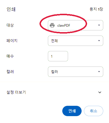 - print icon 을 누르면, 나오는 창에서 clawPDF 선택 하고[인쇄]