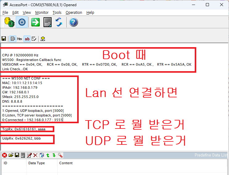 컴파일 , 다운로드 뒤 TTL 232 연결해서 serial 통신 프로그램 access port 로 보면