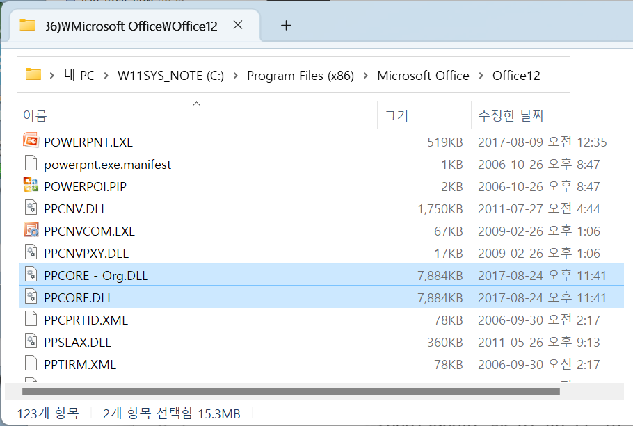1. C:\Program Files (x86)\Microsoft Office\Office12 에서