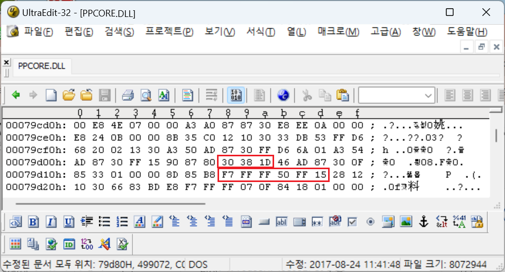 3. UltraEdit 로 PPCORE.DLL 을 열어(Ctrl_O) 검색(Alt-F3) 으로 "30 38 1D" 를 찾는다