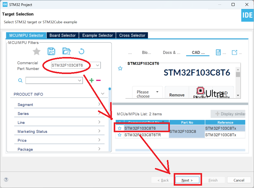 MCU를 STM32F103C8xx( 여기서는 STM32F103C8T6 ) 를 선택 - [Next]
