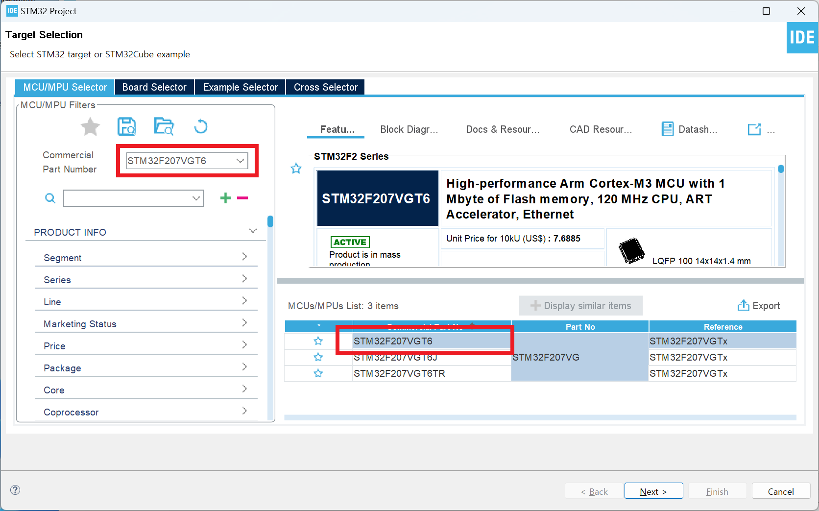 - Target Selection 에서 MCU/MPU Selector 탭에서 Part Number 에 CubeIDE 를 실행하고
