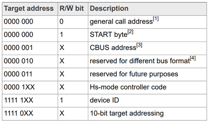 [4] 다른 버스 형식을 위해 예약된 주소는 I2C 및 기타 프로토콜이 혼합될 수 있도록 포함됩니다. 이러한 형식 및 프로토콜과 함께 작동할 수 있는 I2C 버스 호환 장치만 이 주소에 응답할 수 있습니다.