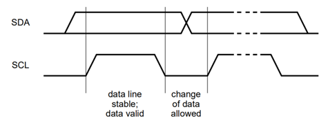 SDA 라인의 데이터는 클록의 HIGH 기간 동안 변하지 말어야 합니다. 데이터 라인의 HIGH 또는 LOW 상태는 SCL 라인의 클록 신호가 LOW일 때만 변경될 수 있습니다(아래 그림 참조). 전송된 각 데이터 비트에 대해 하나의 클럭 펄스가 생성됩니다.