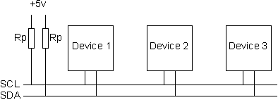 I2C 버스 방식은 n:n 방식 입니다. 참고로RS232 와 같은 것은 1:1 방식 즉 master(혹은 server)-client 방식 이나, I2C 는 RS485 과 같이 n:n 방식 즉 n 개가 붙어 서로 송신 수신 하는 방식 입니다. 그리 보면 RS485는 와 같이 보일 수 있읍니다. 하시만 보통 실제적으로는 한놈(Master)가 쏘고 여러놈(Client)가 받는 방식으로 합니다. 통신선을 송신 수신에 같이 쓰므로 하프 듀풀렉스 ? 라고 할까, RS422 에서는 Master Tx(Client Rx)j 와 Client Tx(Master Rx) 가 각각 2(신호선+신호접지)가닥 즉 4가닥을 쓰지만 I2C 는 Clock+Data+Gnd 3가닥을 씁니다. 접지 또는 0볼트인 세 번째 와이어가 필요합니다. 전원이 장치에 분배되는 5볼트나 3.3볼트나 전선이 있을 수도 있습니다. SCL 및 SDA 라인은 모두 "오픈 드레인" 드라이버입니다. 이것이 의미하는 바는 칩이 출력을 낮게 구동할 수 있지만 높게 구동할 수는 없다는 것입니다. 라인이 높게 갈 수 있으려면 5v 공급 장치에 풀업 저항을 제공해야 합니다. SCL 라인에서 5v 라인으로의 저항과 SDA 라인에서 5v 라인으로의 또 다른 저항이 있어야 합니다. 아래 그림과 같이 각 장치가 아닌 전체 I2C 버스에 대해 한 세트의 풀업 저항만 필요합니다.
