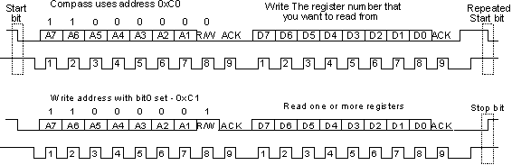 The placement of the 7 bit address in the upper 7 bits of the byte is a source of confusion for the newcomer. It means that to write to address 21, you must actually send out 42 which is 21 moved over by 1 bit. It is probably easier to think of the I2C bus addresses as 8 bit addresses, with even addresses as write only, and the odd addresses as the read address for the same device. To take our CMPS03 for example, this is at address 0xC0 ($C0). You would uses 0xC0 to write to the CMPS03 and 0xC1 to read from it. So the read/write bit just makes it an odd/even address.