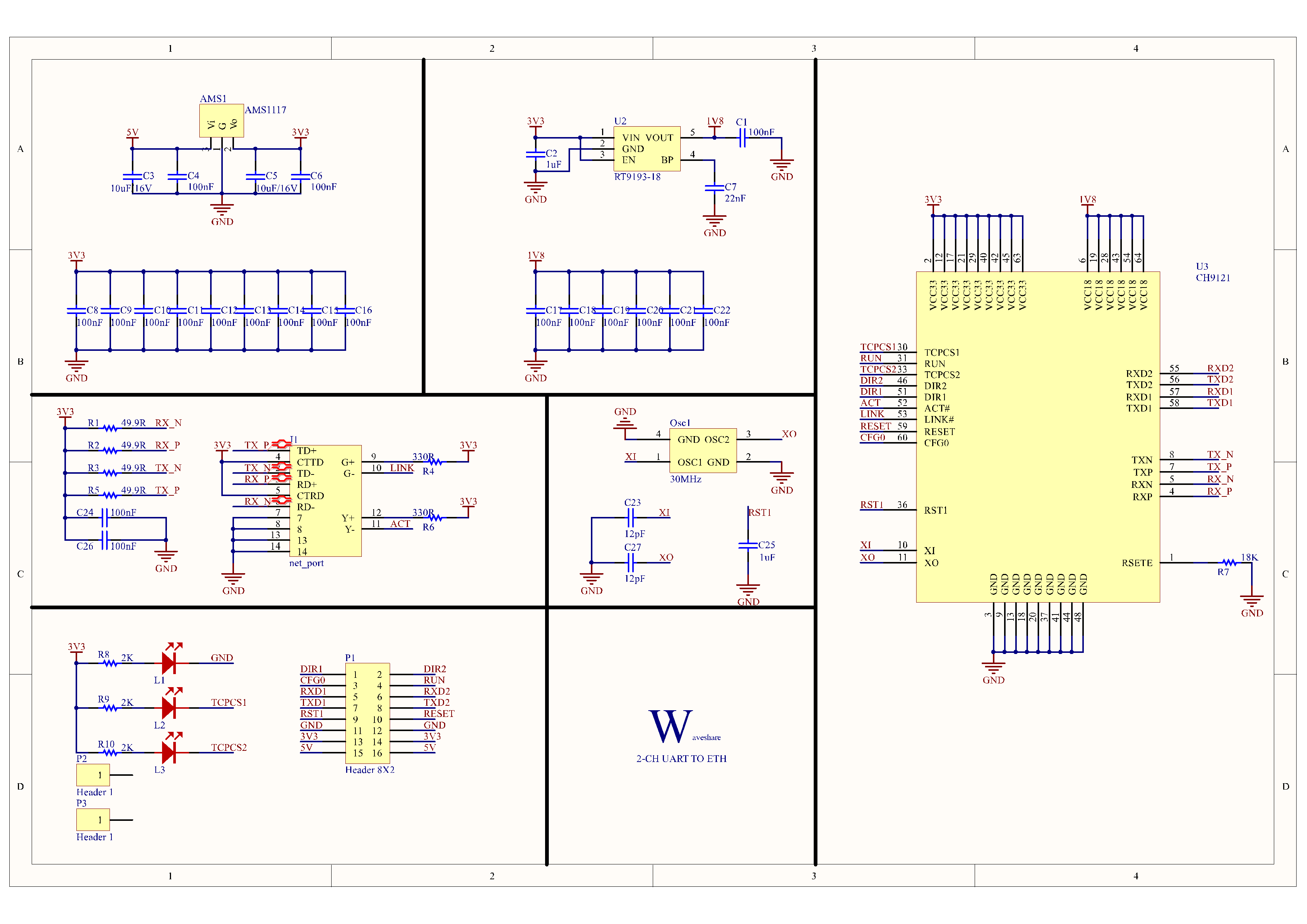 CH9121은 네트워크 직렬 포트 투명 전송용 칩으로 직렬 데이터와 네트워크 데이터의 양방향 투명 전송을 실현할 수 있습니다. TCP CLIENT, SERVER, UDP CLIENT 및 SERVER와 같은 4가지 작업 모드를 지원하며 직렬 포트 전송 속도는 300bps~921600bps입니다. 사용하기 전에 호스트 컴퓨터 소프트웨어 NetModuleConfig.exe 또는 직렬 명령을 통해 칩의 네트워크 매개변수와 직렬 포트 매개변수를 구성해야 합니다. 구성이 완료되면 CH9121은 매개변수를 내부 저장 공간에 저장합니다. 칩이 재설정되면 CH9121은 저장된 구성 값에 따라 작동합니다.