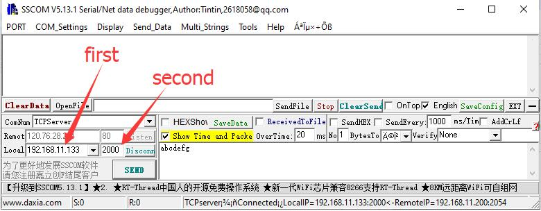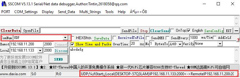 2. UDP CLIENT/서버로 구성된 모듈을 SSCOM을 통해 연결합니다(모드가 CLIENT/서버로 구성되어 있는지 여부에 관계없이 SSCOM의 UDP 모드는 자동으로 연결됩니다). 연결은 다음과 같이 표시됩니다.
