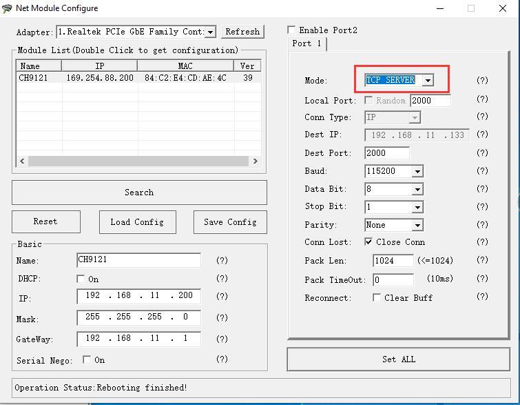 (2) 장치 목록에서 모듈을 두 번 클릭하고 왼쪽의 네트워크 모드를 TCPServre로 수정한 다음 필요에 따라 모듈 매개변수를 수정하고 마지막으로 "장치 매개변수 구성"을 클릭합니다.