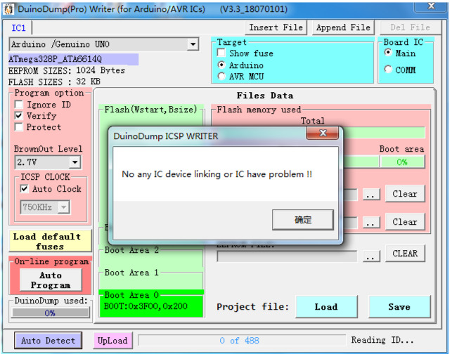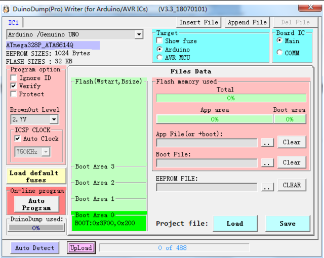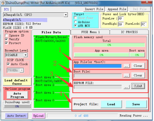 4、 保存或加载项目文件(FLASH,BOOT,EEPROM,FUSE,及 IC PROCESS 操作等设置) 方便下次使用相同项目时不用一项一项的设置