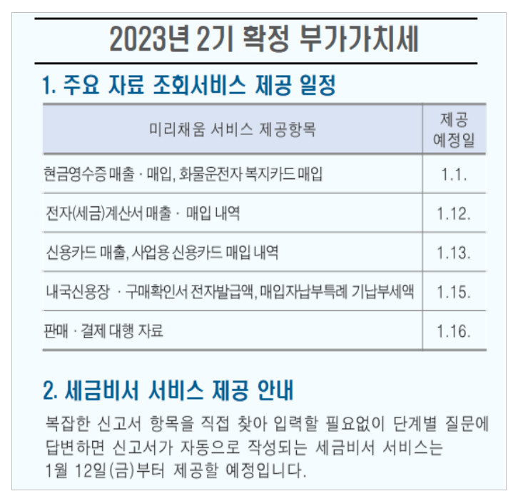 - 홈텍스에서 하면 다음과 같이 여러 자료를 마감일 10일 전에 제공 한다. 아래 이미지는 23년 2기 자료 제공 일정 이다.